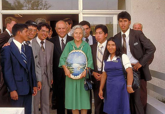 Elder David B. Haight and his wife are presented with a turtle shell painting